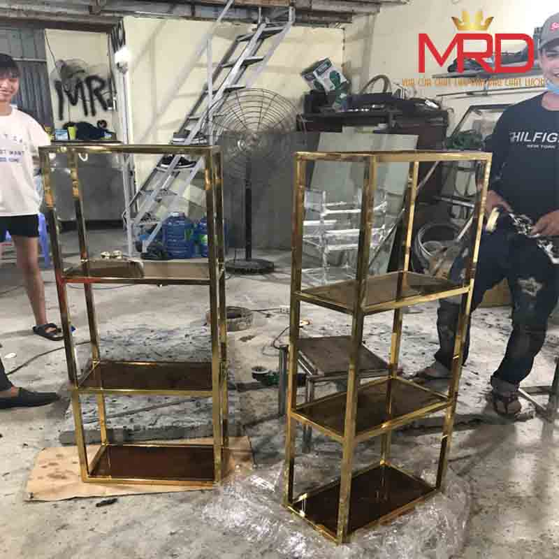 Kệ rượu - Kệ trangf trí khung inox mạ vàng đợt kệ kính