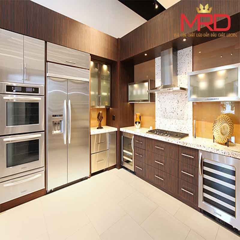 Gỗ Melamine là có cốt gỗ tự nhiên nghiền nhỏ và trộn với keo và các chất kháng ẩm mốc, tạo thành các tấm gỗ có độ dày mỏng khác nhau, bên ngoài được phủ lớp melamine có tính kháng ẩm, kháng lửa và chịu lực tốt rất thích hợp trong thiết kế tủ bếp. Sản phẩm không cong vênh trong quá trình sử dụng và có thể tạo được nhiều kiểu dáng khác nhau, dẽ dàng tháo lắp và di chuyển.